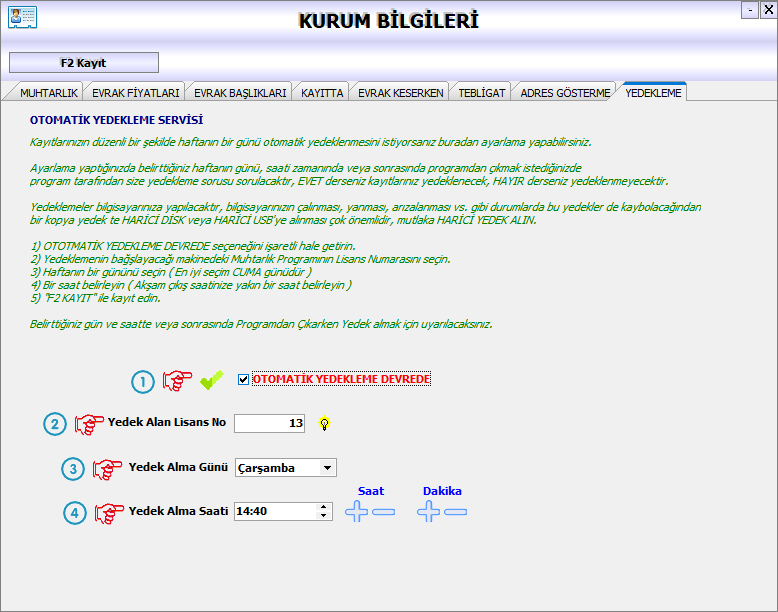 Yeni eklenen Otomatik Yedekleme Ayarlarından yedekleme gününü ve saatini ayarlıyorsunuz, Program size hatırlatıyor.