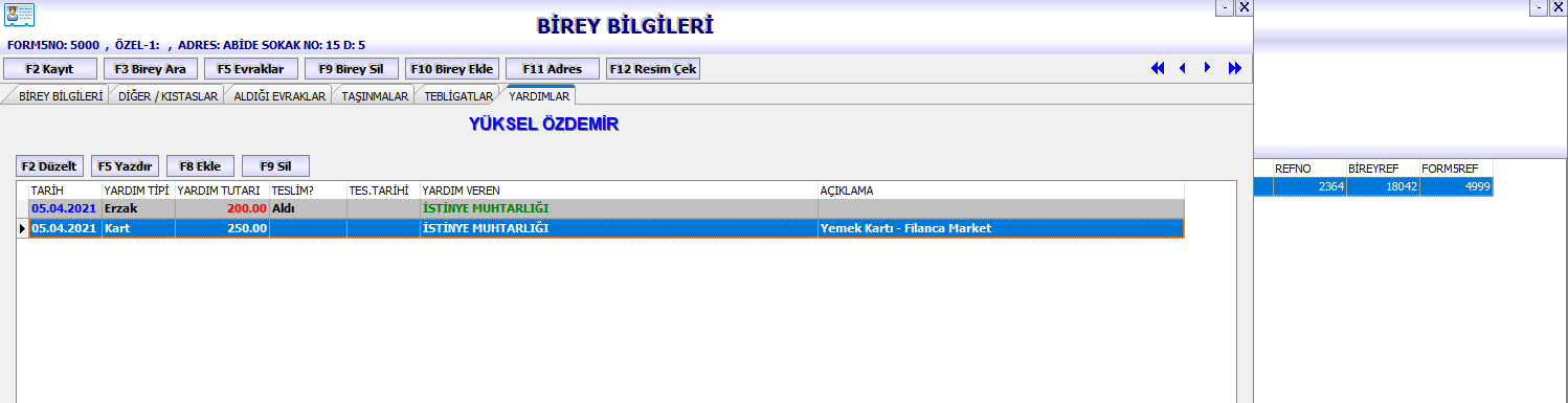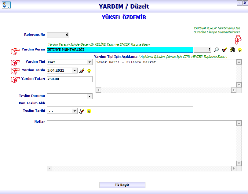 Önce Yardım Edeni sisteme tanıtıyorsunuz sonra, bu yardımı kimler almış işliyorsunuz, böylece yardım dağıtma işlemini.